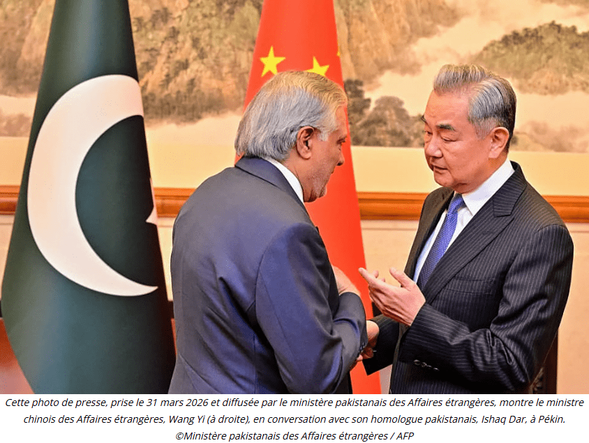 « Mohammad Ishaq Dar a également affirmé avoir le soutien du secrétaire général des Nations unies Antonio Guterres et de son homologue chinois Wang Yi. Les deux diplomates se sont rencontrés à Pékin ce mardi 31 mars pour réclamer un cessez-le-feu et des négociations. La veille, la Chine déclarait « saluer les efforts du Pakistan et l’encourager à poursuivre son rôle de médiateur. » » . Donc pas d’« entrée en scène de Pékin comme comédiateur » ni de « retournement politique remarquable » pour Nodinot, qui n’y voit goutte.