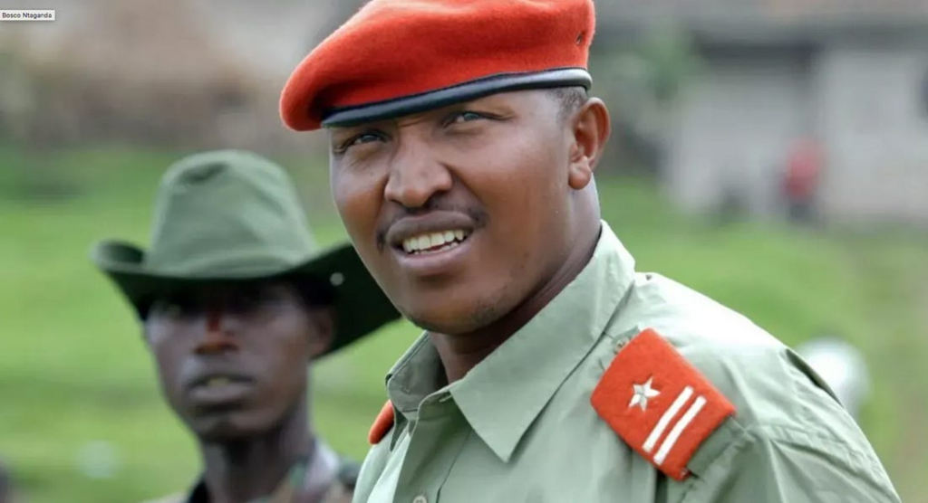Le général rebelle Ntaganda Bosco, escorté par ses camarades, marche dans sa base montagneuse de Kabati, à 40 kilomètres au nord-ouest de Goma, capitale provinciale de la République démocratique du Congo, le 11 janvier 2009. Ntaganda est inculpé de 13 chefs d’accusation de crimes de guerre et de cinq chefs d’accusation de crimes contre l’humanité devant la Cour pénale internationale.