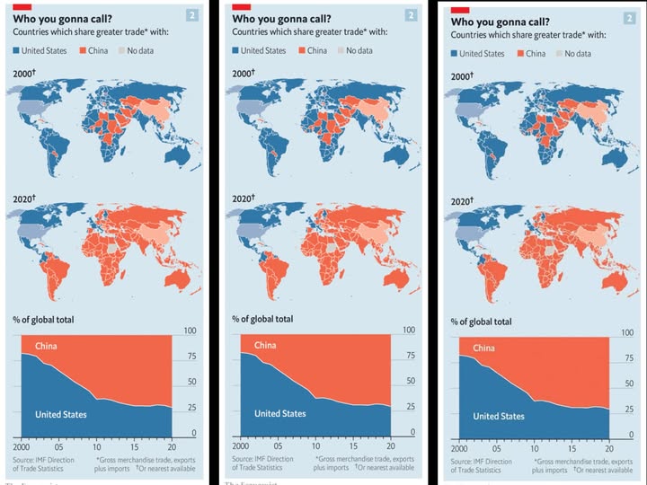 Bon, la carte n’en est qu’une, mais ici elle est reproduite 3 fois, pour quoi ? pour espérer peut-être arriver à vaincre la cécité volontaire dans laquelle la propagande y compris celle d’un Patrick le Hyaric prétend plonger les communistes qui commencent à ouvrir les yeux… Demandez-vous simplement en la voyant : Qui allez-vous appeler en matière de commerce, si vous êtes un pays ? Voilà une « vérité » dont on exige de vous que vous fassiez abstraction pour refuser de voir que la démocratie ne se limite pas aux valeurs occidentales qui ont abandonné les luttes pour les peuples soumis au néocolonialisme, comme celles des couches populaires : comment un peuple du sud par son seul travail et son choix du socialisme a transformé les flux matériels et intellectuels des échanges internationaux autant que le développement de sa propre population.