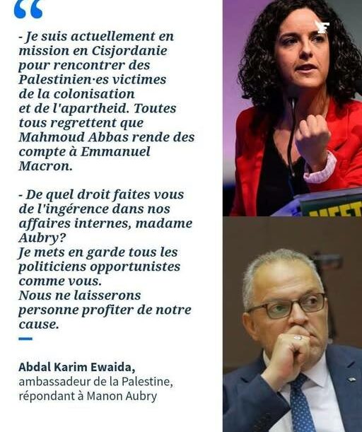 « Il est inacceptable d’affirmer que le président de l’État de Palestine, et non de l’Autorité palestinienne, rende des comptes au président Macron », a-t-il poursuivi, tout en démentant l’absence de consultation du peuple palestinien au sujet du projet de Constitution. « Toute constitution d’un État respectable est soumise à référendum avant son adoption, à moins que Mme Aubry ne nous considère comme des amateurs ou ignorants de ce qu’il convient de faire, a-t-il encore asséné. Je dois dire ici que si Mme Aubry a un différend avec le Président de son pays, ce qui relève des affaires internes, elle ne devrait pas utiliser la Palestine et sa cause dans ce contexte. »