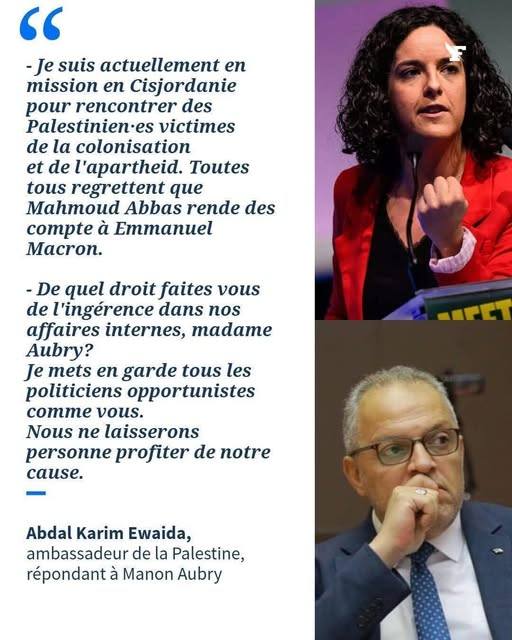 Affirmant « estimer profondément LFI » pour « son engagement en faveur de la cause palestinienne » et remercier Manon Aubry pour sa « visite de plusieurs jours en Palestine pour documenter le régime d’apartheid imposé par l’occupation », il a dénoncé l’absence de rencontre de la députée française « avec une personnalité officielle ». « Elle n’a posé aucune question à des représentants officiels après avoir écouté directement plusieurs personnes, qui, à mon avis, ne peuvent représenter l’opinion publique sur laquelle elle a basé le message qu’elle a publié », a-t-il regretté.