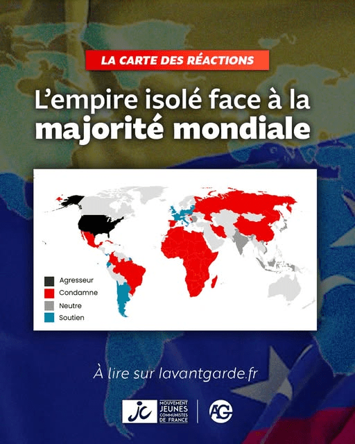 donc cette carte qui est déjà très parlante est partiellement inexacte : le Venezuela mis dans les pays neutre ne l’est pas du tout et s’affirme résolument contre. La Turquie n’est pas un soutien sans faille, et quant aux neutralités dans le pacifique elles sont bien fragiles ; cette affaire ne rend pas plus confortable la situation du Japon, le seul allié véritable des USA menacé d’étranglement. Quant aux Etats-Unis eux-mêmes on ne peut pas dire que l’opération y jouisse d’un soutien majoritaire… on peut d’ailleurs signaler aux amateurs d’ambiance que le traité New Start, dernier vestige des accords de maîtrise des armements entre les États-Unis et la Russie, s’apprête à expirer, le 6 février dans un contexte de forte tension géopolitique, en Ukraine évidemment, mais aussi au Venezuela et au Groenland. Prolongé et signé à Prague en 2010, ce traité a fixé des limites strictes aux arsenaux stratégiques des deux puissances nucléaires, instauré une transparence entre adversaires et, jusqu’à récemment, contribué à contenir les dépenses liées aux armes les plus destructrices jamais inventées. Et pour que nous sachions où nous mettons les pieds après que la « coalition » ait décidé de contribuer après un hypothétique cessez-le-feu en Ukraine et que Macron ait proposé d’envoyer des milliers de soldats français, les Russes leur ont répondu qu’il les considèreraient comme des cibles légitimes. Tandis que Trump explique non sans perspicacité que sans lui l’OTAN ne ferait peur à personne… Il est clair que nous ne sommes pas nous Français dans une réalité multipolaire mais dans la dure loi de la domination de notre maître US mais ne projetons pas notre situation sur celles de pays qui se sont engagés dans cette démarche…