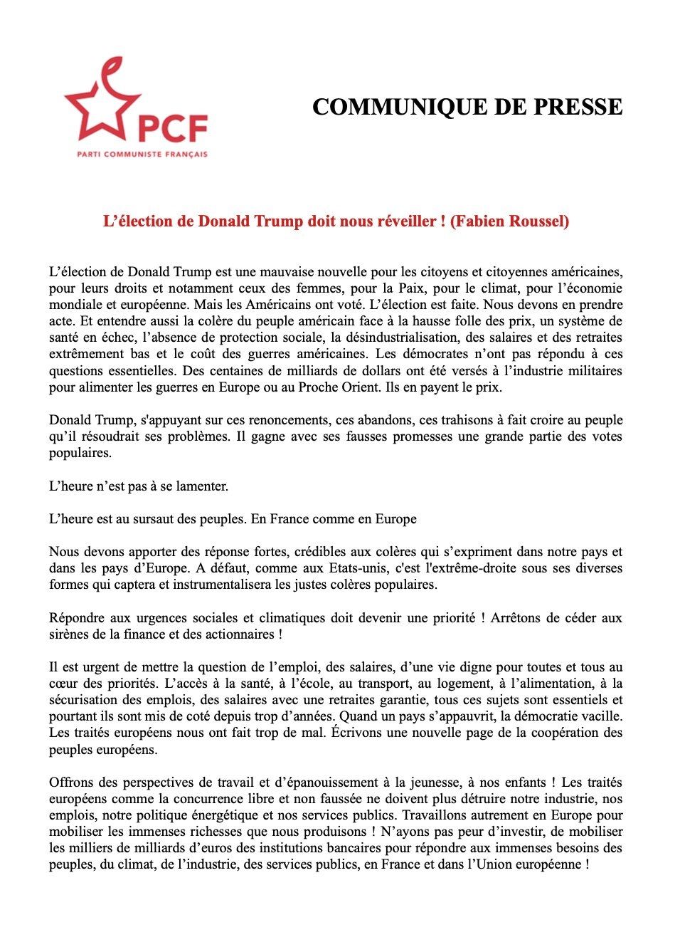 Il ne s’agit pas de dire que l’élection de Kamala Harris aurait été une victoire. Et le ton du communiqué n’est pas à la lamentation. L’élection de Trump n°2, qui sera nécessairement autre chose que Trump n°1 appelle à la lucidité et à l’action et il me semble que c’est ce qui est fait ici.