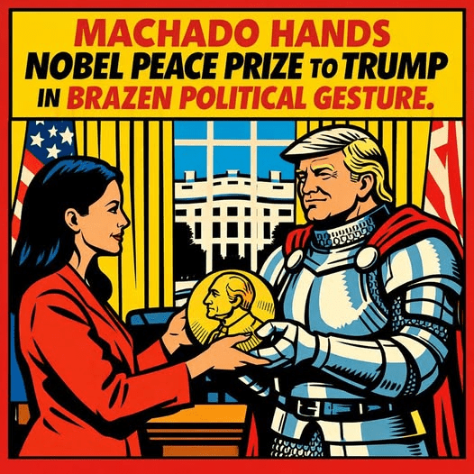 Au titre des chefs d’oeuvre de l’iconographie je me permets d’ajouter ce dessin représentant ce moment immortel de la grandeur des USA qui représente Machado en train de donner son prix Nobel de la paix à Trump en remerciement de l’invasion de son peuple et des centaines de morts… Comme le dit l’auteur de l’article : nous ne devrions toutefois pas adopter une attitude aussi hautaine. Les gens croient encore à toutes sortes de contrevérités et de mensonges absurdes. Cela concerne notamment l’actuel occupant de la Maison-Blanche, de nombreux membres du Congrès et des juges fédéraux. Si ces mensonges ne sont pas les mêmes que ceux propagés dans « Is This Tomorrow ? », « This Godless Communism », « The Two Faces of Communism » ou « America Under Socialism », c’est un maigre réconfort. Les socialistes peuvent rire, mais la prévalence de toute cette propagande nous rappelle avec force la pression idéologique à laquelle nous sommes confrontés lorsque nous essayons de diffuser notre message. On peut rire, certes. Mais n’oublions pas que les auteurs de ces bandes dessinées prenaient les choses très au sérieux (note et traduction de Danielle Bleitrach pour histoireetsociete).