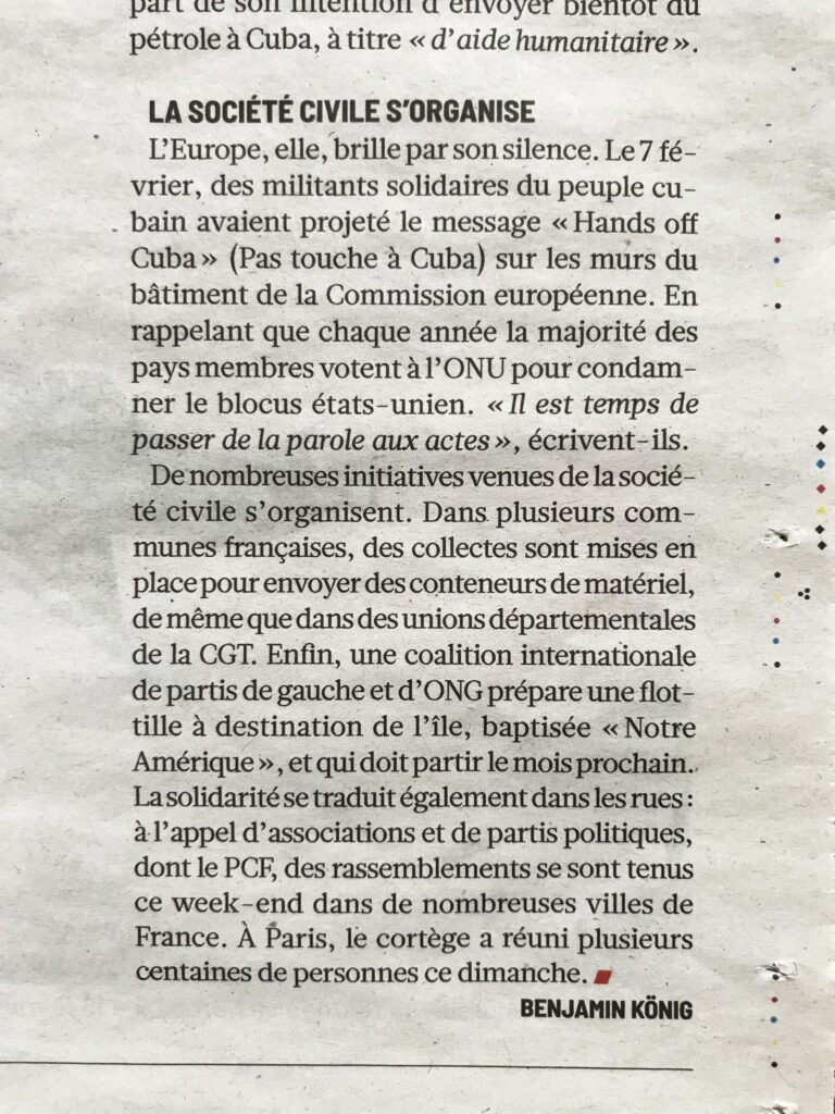 Ce lundi 16 février j’attendais autre chose qu’un article insignifiant, voire méprisant pour le PCF, seul parti d’envergure ayant appelé et organisé les rassemblements pour CUBA. En marge de la double page consacrée à Francesca Albanese (rien à dire) un petit article de 3 paragraphes titre sur « Un élan de solidarité mondial pour Cuba »… C’est un peu juste, pour un élan de solidarité mondial, non? Plus grave, sur les 3 paragraphes un est intitulé « La société civile s’organise » où l’on cite pêle-mêle les initiatives, et en fin d’article le pseudo-journaliste qui ne s’est manifestement pas rendu sur les lieux de manifestations écrit qu' »à l’appel d’associations et de partis politiques, dont le PCF, des rassemblements se sont tenus dans de nombreuses villes de France ». Si ce journaliste avait fait son boulot il aurait vite vu que le PRCF, Révolution Permanente, la CGT etc. ont appelé à rejoindre l’action initiée par… le PCF. Pas par le PS, pas par LFI, pas par EELV, par le PCF ! Je me suis dit, c’est pas possible il y aura quelque chose mardi. Non mardi, il n’y avait rien sur CUBA ni sur le PCF d’ailleurs.