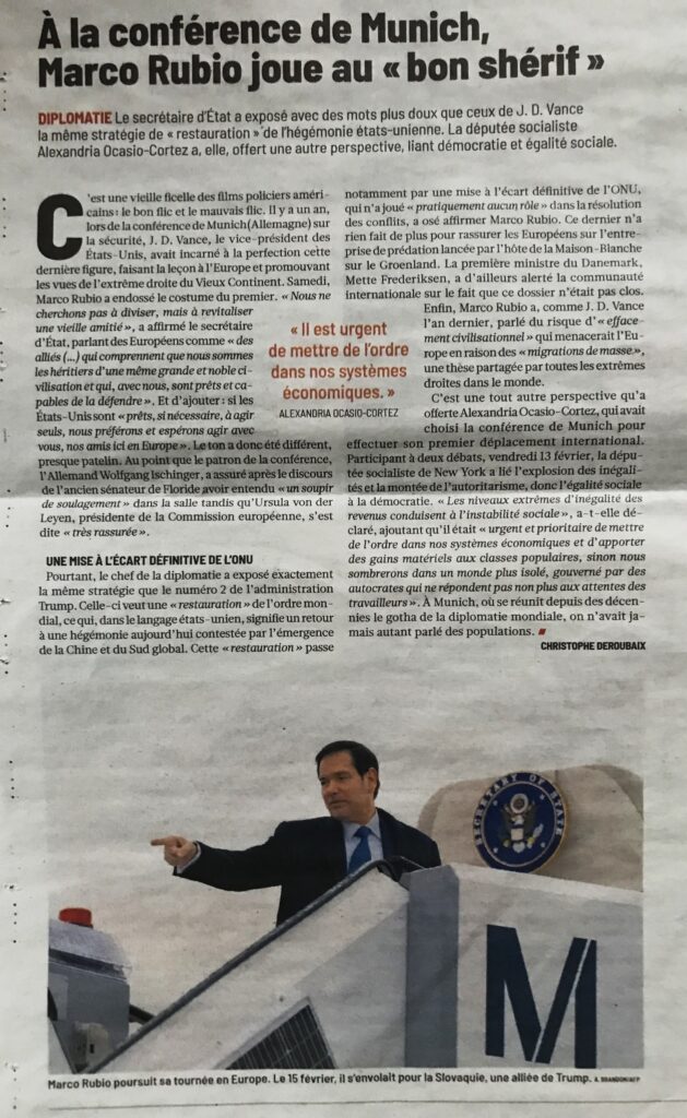 L’autre article est celui relatif à la conférence de Munich. Si l’analyse globale n’est pas mauvaise, elle est toutefois assez faible et largement sous-documentée. un conseil : réduire la taille des photos, surtout celle de Rubio, et augmenter le texte… Bref, le journaliste n’a retenu comme réponse à Rubio que l’intervention de la Démocrate américaine Alexandra-Ocasio-Cortez qui semble faire fi des enjeux internationaux, comme la paix par exemple. Si on n’est pas un peu curieux, on en reste à cette information très en-deça de ce qu’un journal dit communiste devrait produire. Je conseille donc aux journalistes de l’Humanité traitant des questions internationales de consulter le site Histoire et société où l’on retrouve pléthore d’articles autrement documentés. A la conférence de Munich il y avait aussi Wang Yi, tiens c’est étrange, et l’article trouvé sur le site Histoire et société dit ceci, ce qui me parait bien plus… communiste !