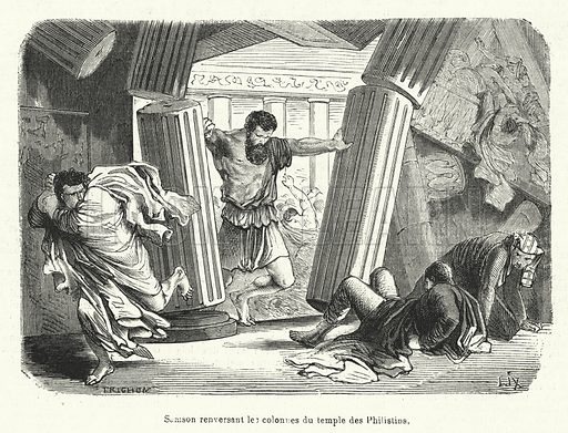 (1),A l’occasion d’un sacrifice à leur dieu Dagon, les Philistins font venir Samson aveugle mais qui a retrouvé sa force avec sa chevelure dans leur temple pour qu’il les amuse. Samson invoque Yahvé et s’arc-boutant contre les deux colonnes du milieu du temple, il fait écrouler l’édifice sur lui et sur les Philistins.