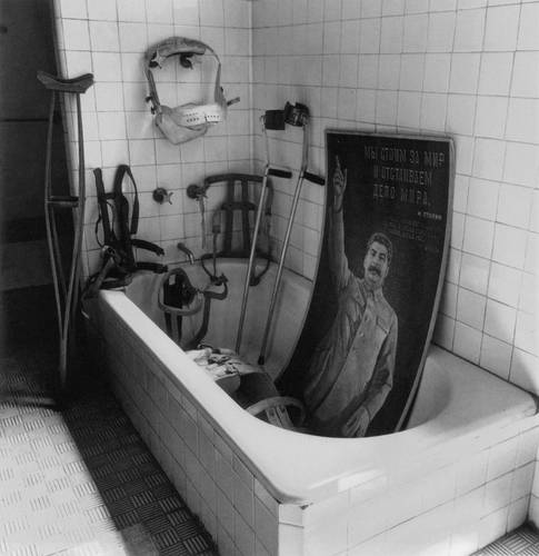 Depuis 50 ans la salle de bain de l’artiste était scellée selon la volonté de son mari Diego Riviera. La directrice de la maison-musée de Frida a ouvert les portes de ce temple de faïence à l’œil merveilleusement profanateur de Iturbide. Sobriété de chambre funéraire, souvenirs de la douleur du corps infirme, corsets, béquilles, drogues, appareillage rustique pour avortement, affiches communistes… On se croirait dans un tableau de la mexicaine, une ultime installation post mortem témoignant de ses expériences, angoisses et fantasmes. Tout est capté avec le sens du morbide, du hiératique et du sanglant dont l’une et l’autre, peintre et photographe, sont les expertes.