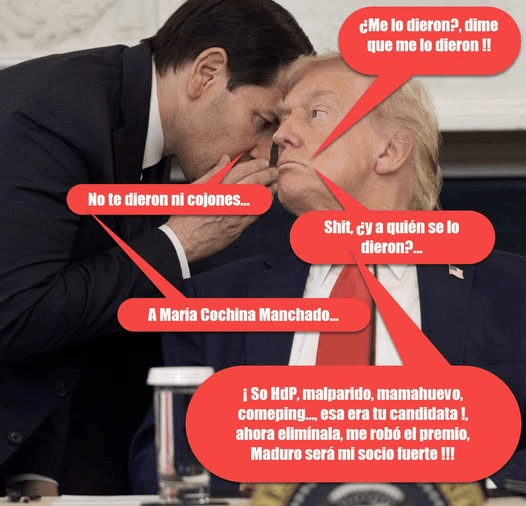 Donc on voit que les rumeurs qui aujourd’hui tentent de vendre le Nobel comme un camouflet infligé à Trump, une manière de l’écarter en choisissant une femme, une démocrate relèvent simplement des querelles internes au sein de la vassalité la plus totale à l’impérialisme des Etats-Unis, le paradoxe est que le jury a choisi le plus réactionnaire si faire se peut, la plus belliciste sûrement.
