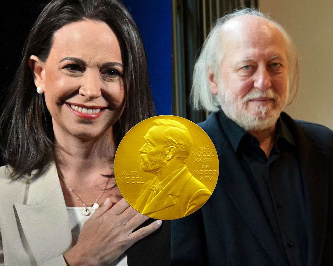 C’est la semaine du prix Nobel. Et les lauréats 2025 sont : László Krasznahorkai en littérature ; et María Corina Machado dans le prix de la paix. Le premier dit ce qu’est la littérature dans le continent européen et la manière dont de guerres mondiales en guerres mondiales, l’art décrit la décomposition dans la vassalité et les petites imprécations, de Musil à Thomas Bernhard en passant bien sûr par Kafka. L’art pour l’art et le scepticisme drolatique et sans aucune issue post démocratique, pratique le rébarbatif, le dédale sans fin dans le no man’s land comme l’humour noir de l’encrassement des intelligences, le creux verbiage de la servilité dans l’orthodoxie et le délire des aliénés, entre l’horreur et la fantaisie. Mais il y a pire, dans ce prisme du « post-démocratique » de l’ennui philistin, intervient le choix de Machado, la vénézuélienne agent de la CIA. Cette pantalonnade est accomplie par un petit pays européen qui prétend exercer son soft power en brandissant chaque année une boule à facette lumineuse, un objet du désir pour les ambitions répugnantes des arrogants incultes maitres du monde des Etats-Unis. Mais comme l’Europe a des prétentions à masquer ses cabrioles de singe savant derrière « sa conscience » en écharpe, il est dit que ce choix défie Trump, l’incivil. Ce coup de pied de l’âne contre le suzerain Trump s’exerce sur la pente qui a été, dès 1945, celui du Nobel et d’une Norvège qui comme le reste de l’UE avait beaucoup à se faire pardonner et l’a pratiqué depuis longtemps en défense de l’OTAN et de la CIA. Ce qui aboutit au paradoxe de transformer Trump en ultime et vaine tentative pour sauver l’impérialisme hégémonique de l’apocalypse auquel le monde occidental parait incapable d’échapper. Autopsie du cadavre de deux prix Nobel (1)