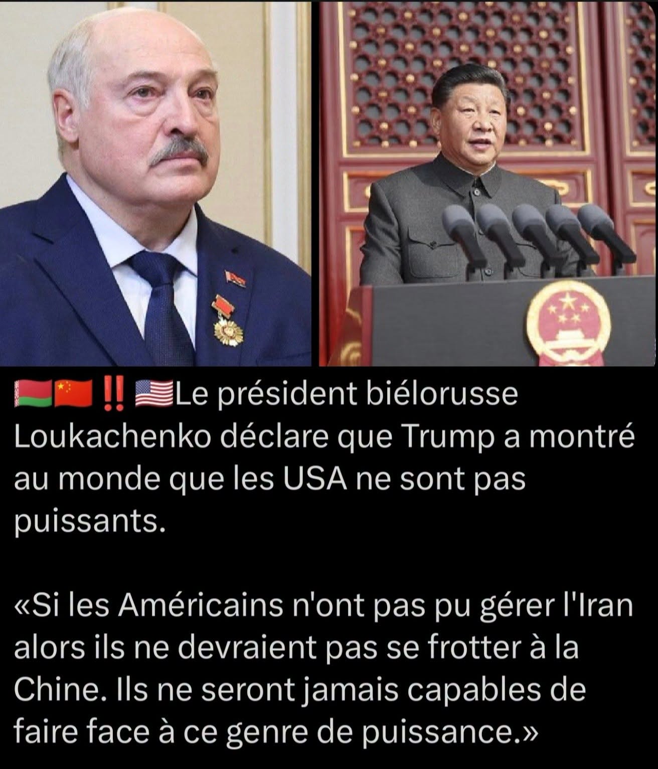 «Si les Américains n’ont pas pu gérer l’Iran alors ils ne devraient pas se frotter à la Chine. Ils ne seront jamais capables de faire face à ce genre de puissance.» CQFD