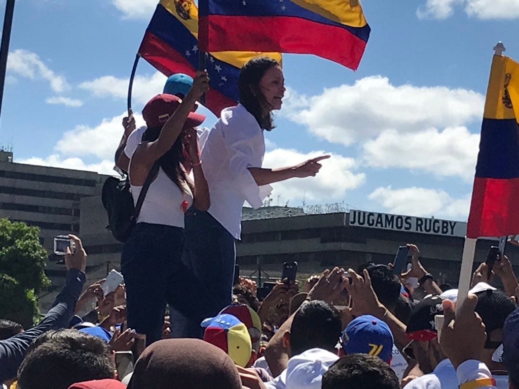 Ci-dessus : Machado tente de soulever les membres de la classe supérieure de l’opposition vénézuélienne pour qu’ils s’emparent de la base aérienne de Carlota à Caracas, le 23 février 2019 (photo de Max Blumenthal)