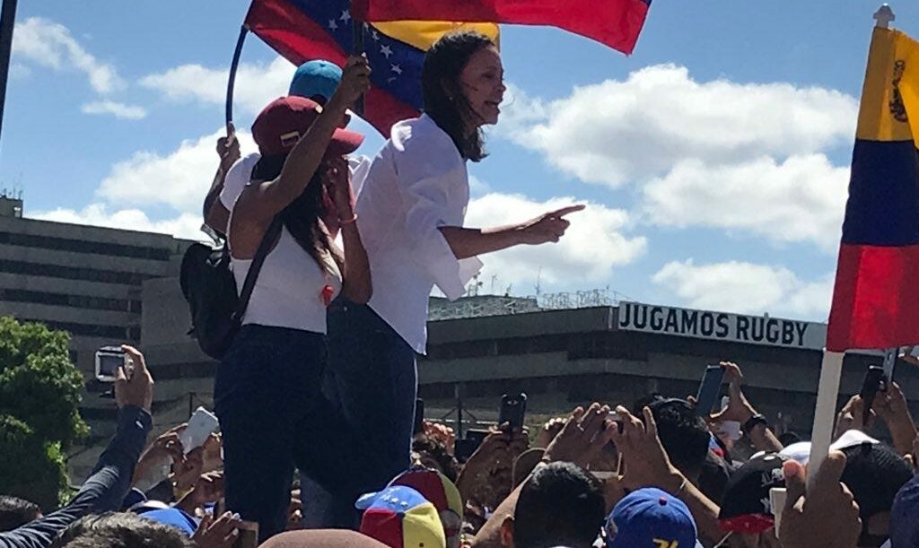 Ci-dessus : Machado tente de soulever les membres de la classe supérieure de l’opposition vénézuélienne pour qu’ils s’emparent de la base aérienne de Carlota à Caracas, le 23 février 2019 (photo de Max Blumenthal)
