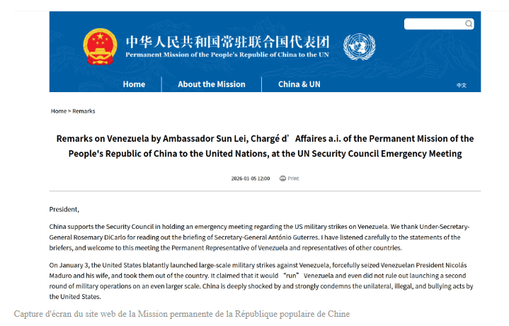 L’envoyé chinois dénonce quatre « violations graves » commises par les États-Unis lors d’une réunion de l’ONU et appelle à la libération immédiate de Maduro et de son épouse.