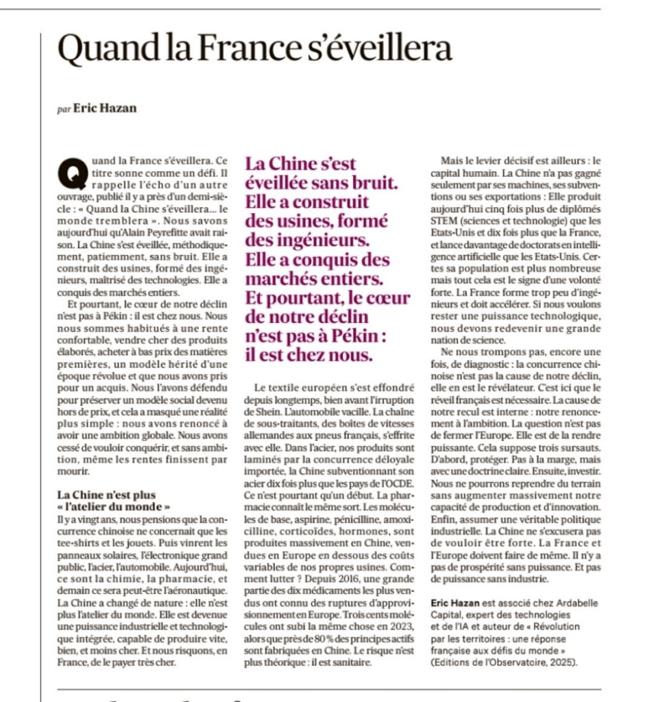 Quand la France s’éveillera. Ce titre sonne comme un défi. Il rappelle l’écho d’un autre ouvrage, publié il y a près d’un demi-siècle : « Quand la Chine s’éveillera… le monde tremblera ». Nous savons aujourd’hui qu’Alain Peyrefitte avait raison. La Chine s’est éveillée, méthodiquement, patiemment, sans bruit. Elle a construit des usines, formé des ingénieurs, maîtrisé des technologies. Elle a conquis des marchés entiers.