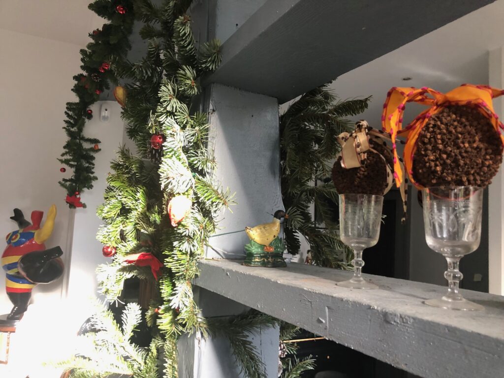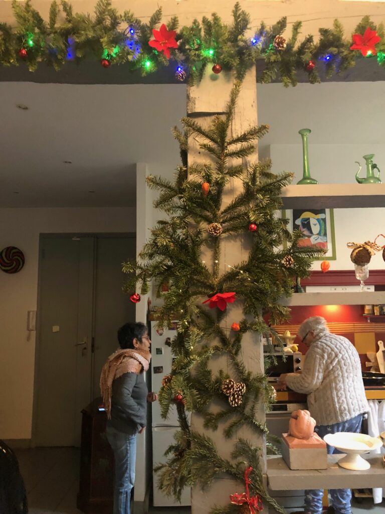C’est désormais une tradition, grâce à mon amie Maria, ma salle de séjour devient un gigantesque sapin de Noël avec des décorations « maison » autour de branches d’arbres, des pommes de pins aux écailles peintes à la peinture blanche, des fleurs séchées, des fleurs artificielles et naturelles comme ces petits lampions oranges ou des cosses de marrons poilus, des oranges piquées de clous de girofle déposés chaque année dans de petits verres en cristal, les statues de mon décor ordinaire magnifiées par ces branches et des guirlandes lumineuses, un petit festin provençal que je prépare en mijotant de longues heures avec l’odeur des fumets.. L’après-midi nous sommes allées dans l’église de la place sur laquelle je vis pour y allumer des veilleuses au nom de tous les disparus… et le tout au son de la musique baroque et des Noël religieux mais la viande, une épaule d’agneau était hallal parce que tous ceux avec qui nous la partageons sont musulmans…