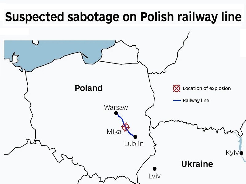 Les enquêteurs polonais affirment qu’une voie ferrée reliant Varsovie à Lublin a été endommagée par ce qu’ils pensent être une explosion. Le Premier ministre Donald Tusk a écrit sur X que « faire sauter la voie ferrée sur la ligne Varsovie-Lublin est un acte de sabotage sans précédent visant directement la sécurité de l’État polonais et de ses civils. Cette route est également cruciale pour la livraison de l’aide à l’Ukraine. Nous attraperons les coupables, qui qu’ils soient. » Le contexte entourant cet incident est très pertinent.