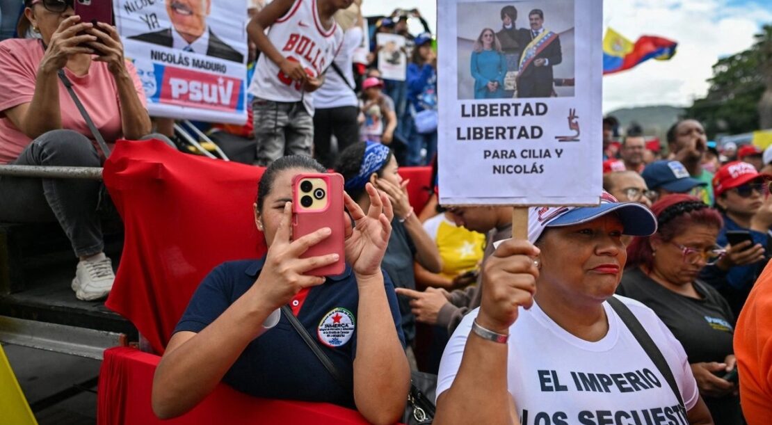 Un manifestant brandit une photo de l’ancien président vénézuélien Nicolás Maduro et de son épouse, Cilia Flores, lors d’un rassemblement de soutien à Caracas le 10 janvier 2026. Photo AFP