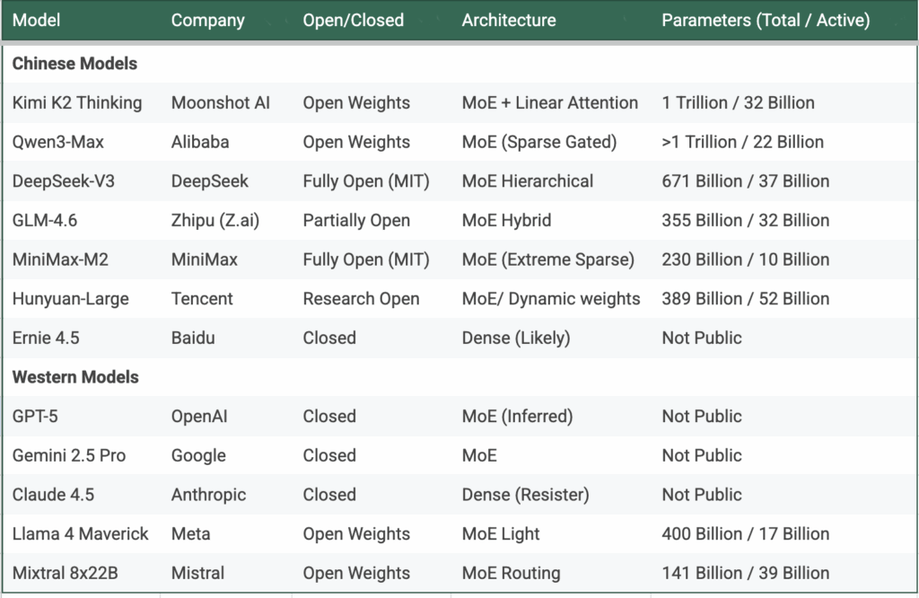 Au cœur de cette vague se trouve un principe : faire plus avec moins. La technologie qui sous-tend cette nouvelle vague est le Mixture of Experts (MoE). En résumé, les modèles chinois ont tous adopté le MoE. Ils innovent désormais dans ce cadre, créant sans cesse de nouvelles vagues d’efficacité. En revanche, quelques modèles occidentaux clés, comme Claude d’Anthropic, résistent totalement au MoE. D’autres l’ont adopté, mais sans accorder la même importance à l’efficacité. En Chine, la course est désormais lancée. Le nombre de nouvelles orientations, la rapidité des annonces et la qualité de l’exécution sont époustouflants. Le reste de cette section peut être ignoré par ceux qui ne s’intéressent pas aux détails généraux du MoE.