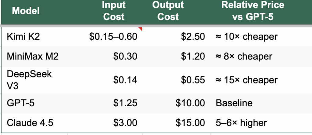 Le modèle à 671 milliards de paramètres de DeepSeek a coûté moins de six millions de dollars, et le même chiffre circule pour le dernier modèle Kiimi, qui rivalise avec le meilleur modèle d’OpenAI dans les benchmarks populaires. Que les coûts de formation réels soient ceux annoncés ou plusieurs fois supérieurs, ces modèles sont formés de manière extrêmement rentable. En conséquence, les équipes chinoises peuvent facturer quelques centimes et continuer à dégager des marges. Leurs API sont dix à cinquante fois moins chères que leurs équivalents occidentaux. Elles ont besoin de moins d’utilisateurs pour atteindre le seuil de rentabilité.