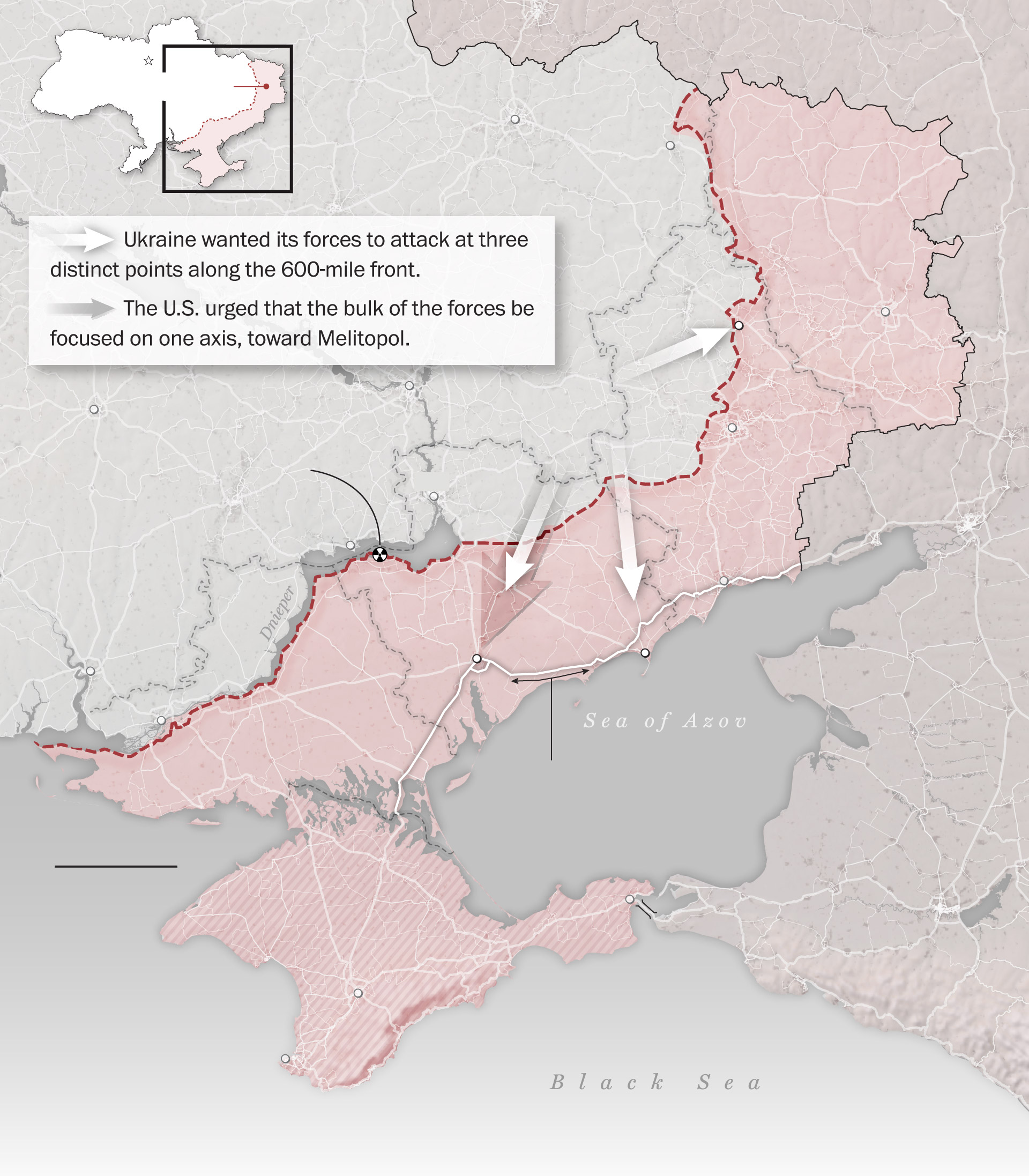 ● Les États-Unis ont préconisé un assaut ciblé le long de cet axe sud, mais les dirigeants ukrainiens ont estimé que leurs forces devaient attaquer en trois points distincts le long du front de 600 milles, vers le sud en direction de Melitopol et de Berdiansk sur la mer d’Azov et vers l’est en direction de la ville assiégée de Bakhmut.