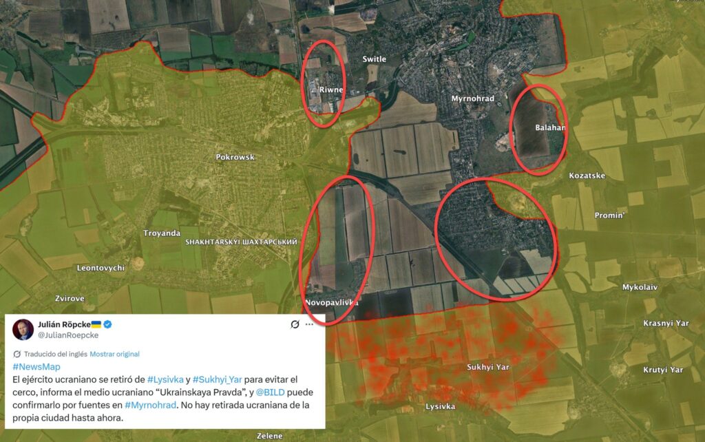 El ejército ucraniano se retiró de #Lysivka y #Sukhyi_Yar para evitar el cerco, informa el medio ucraniano “Ukrainskaya Pravda”, y @BILD puede confirmarlo por fuentes en #Myrnohrad. No hay retirada ucraniana de la propia ciudad hasta ahora.