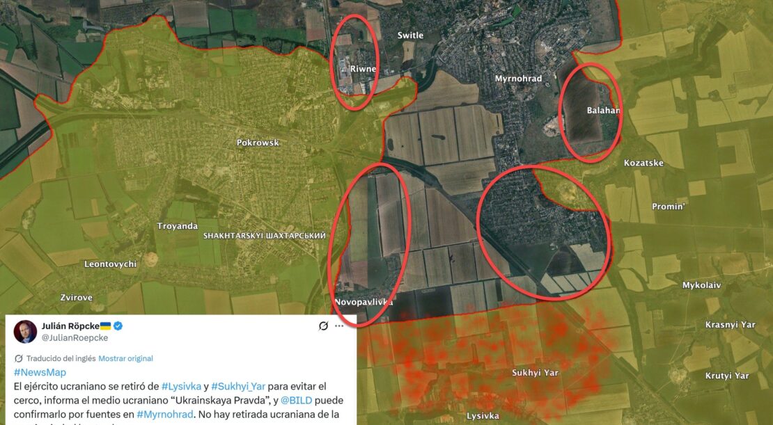 No guanajo juntaletras, en primera, « Riwne » ya cayó, tú mismo lo informaste, Lysivka hace rato que está en manos rusas y Sukhy Yar, la mitad norte estaba en manos de los ucronazis, ahora no se retiraron, fueron expulsados al cerco de Myrnohrad, que obviamente es mucho más pequeña de lo que muestras, Novopavlivka cayó hace 12 días. Lo bueno, que al menos muestras que Pokrovsk ha sido liberado al 100% ¿qué te pasó con la bandera y los edificios de ayer?…